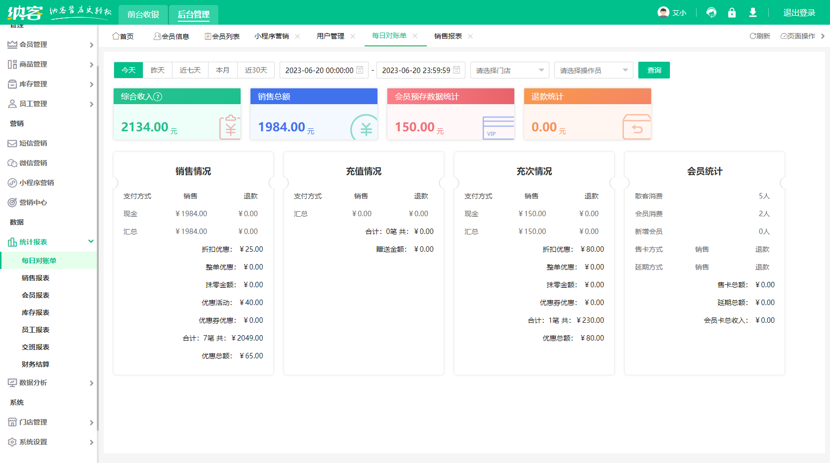1、会员管理:会员消费明细,会员积分,会员信息,会员折扣,会员卡充值。